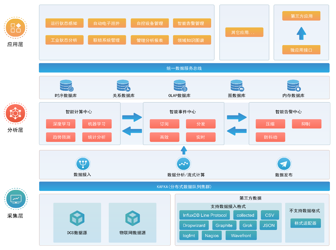 油氣田大數(shù)據(jù)智能分析軟件通過工業(yè)常用的通訊協(xié)議,對氣田井站、管道、儀表、附屬設(shè)施工業(yè)生產(chǎn)現(xiàn)場的進行在線分析和智能監(jiān)控,實現(xiàn)實時數(shù)據(jù)采集、在線診斷、一體化管理、風(fēng)險提前預(yù)警、故障快速定位,輔助提升氣田生產(chǎn)運維人員工作效率,保障氣田生產(chǎn)穩(wěn)定運行。主要提供五大基礎(chǔ)功能,六項專業(yè)能力。